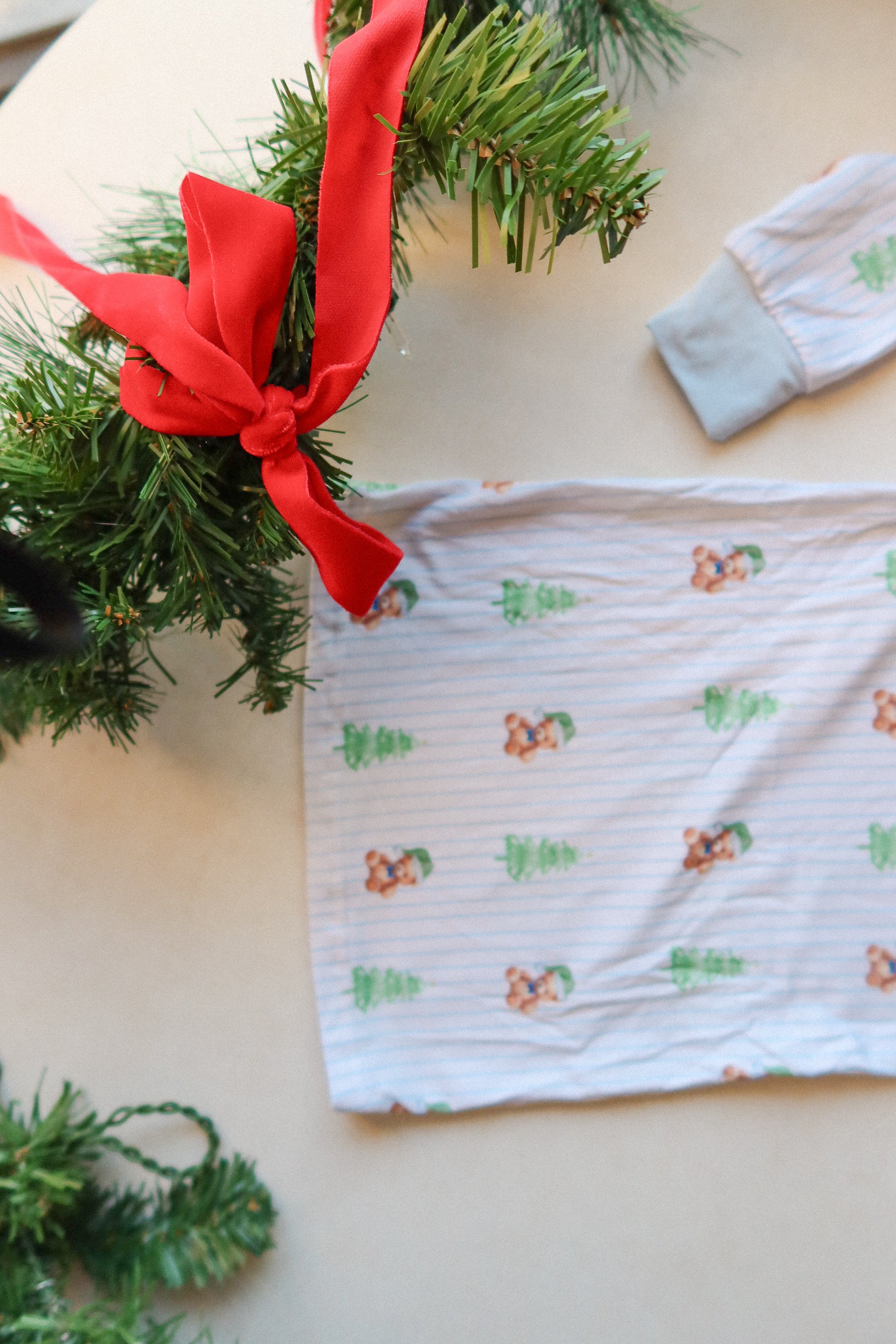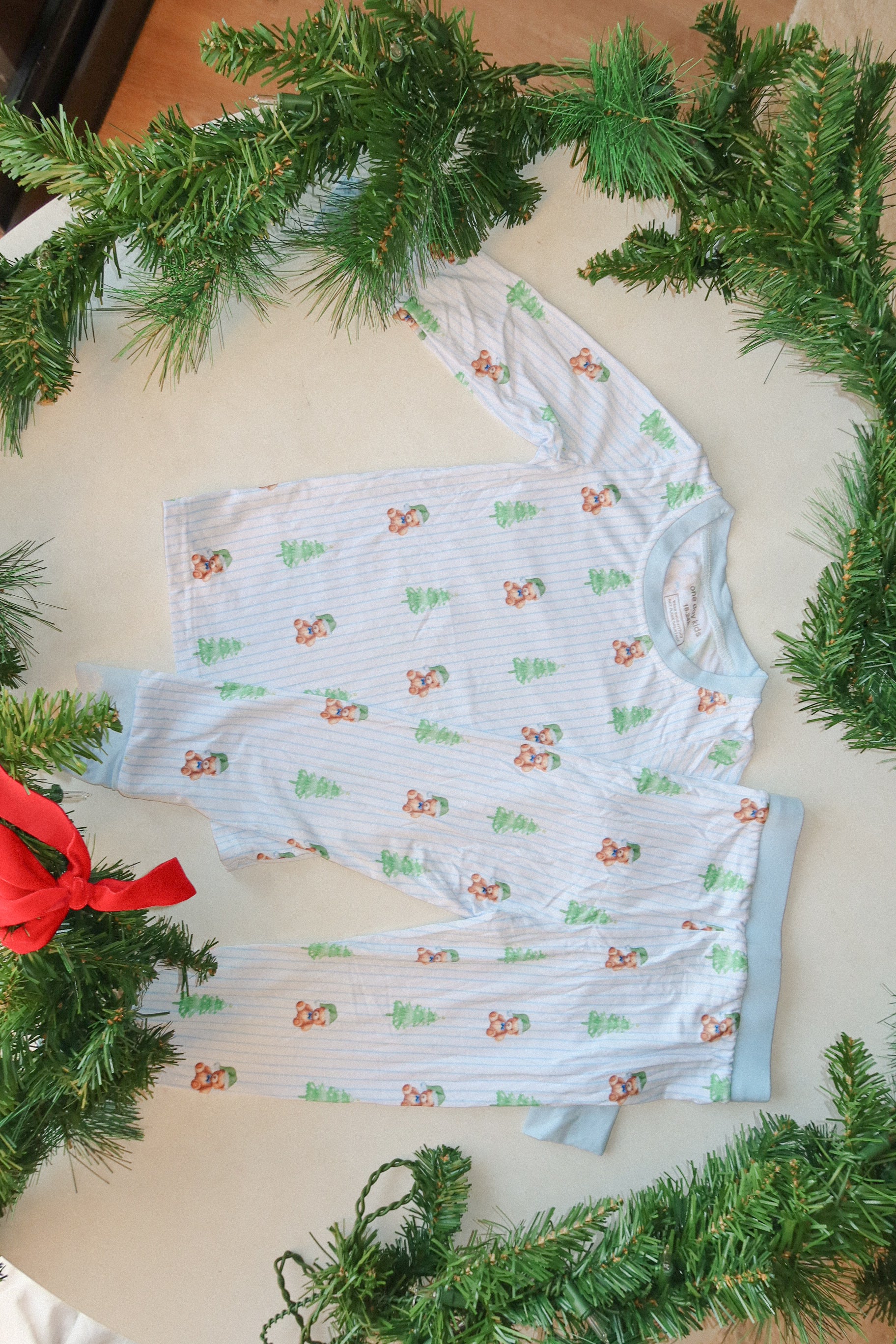 Introducing our very first one day kids designed bamboo Christmas pajamas in a blue pinstriped bear pattern. Crafted from luxurious 240gsm bamboo fabric, this lounge set is a testament to softness and sustainability. Perfectly blending comfort with elegance, they are designed to grow with your little one. With its stretchy material, this set offers unparalleled freedom of movement, making it ideal for playdates, lounging sessions, or peaceful sleep.