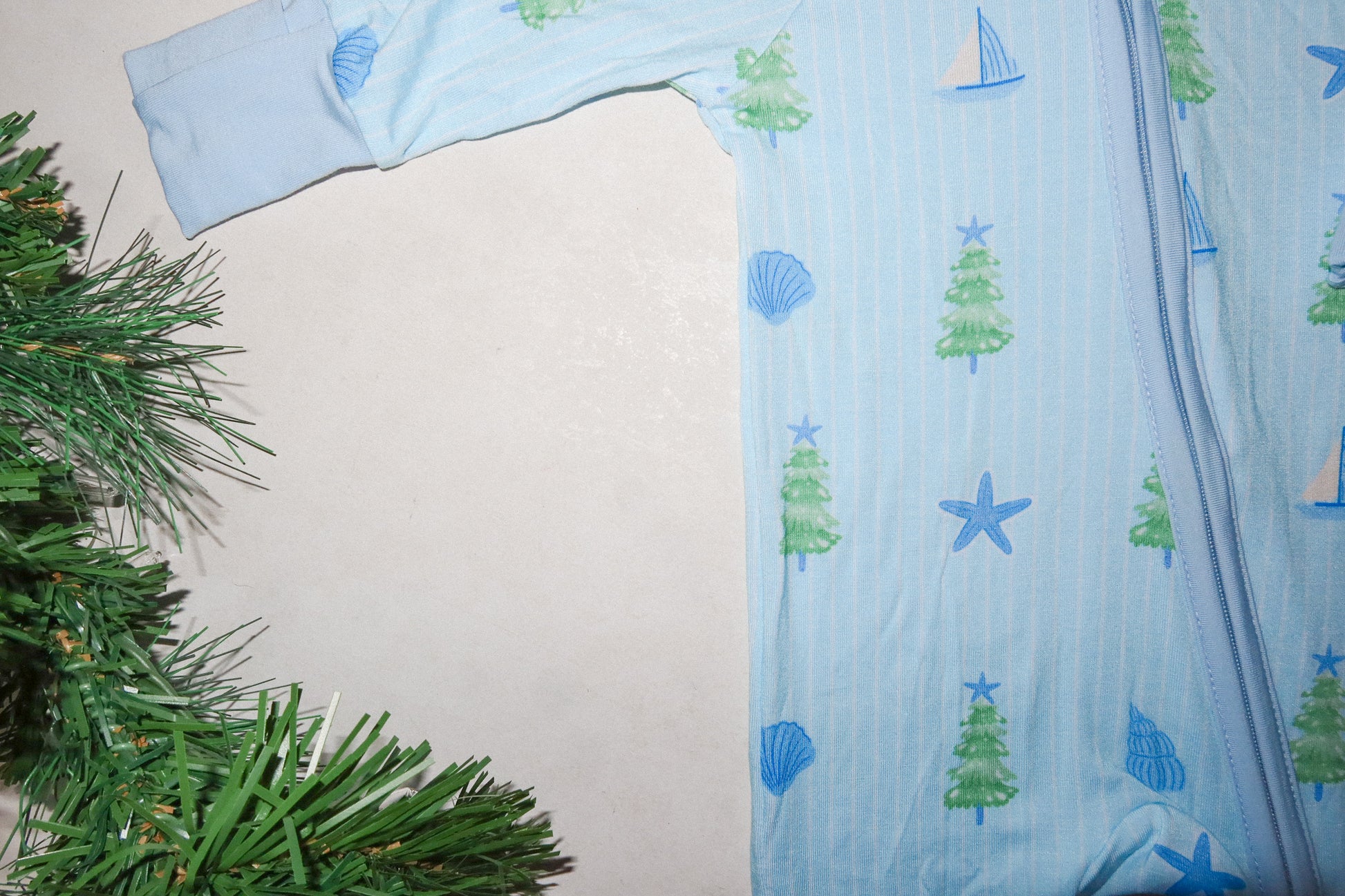Introducing our very first one day kids designed bamboo Christmas pajamas in our blue coastal pattern. Our bamboo pajamas are made with fold-over cuffs for both hand and feet, designed with your little one's comfort and convenience in mind. Crafted from premium 240gsm bamboo fabric, this footie is not only luxuriously soft but also highly breathable and lightweight, ensuring your baby stays cozy and comfortable throughout the night. The inclusion of YKK zippers ensures easy dressing and diaper changes, while also promising durability for long-lasting wear. Plus, with two-way YKK zippers, dressing and diaper changes become a breeze, offering easy access from both the top and bottom. Perfectly blending comfort with elegance, they are designed to grow with your little one. With its stretchy material, this set offers unparalleled freedom of movement, making it ideal for playdates, lounging sessions, or peaceful sleep.