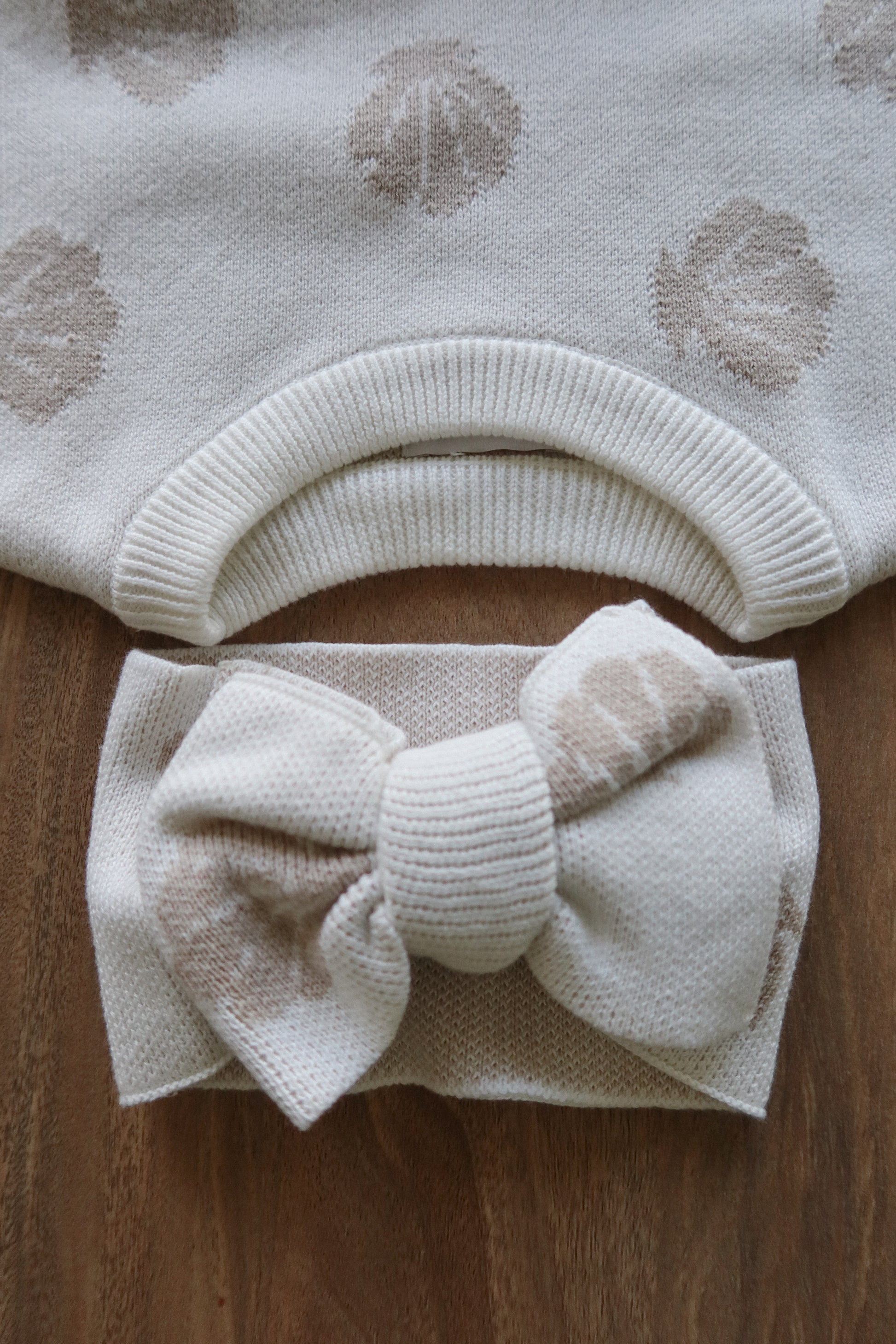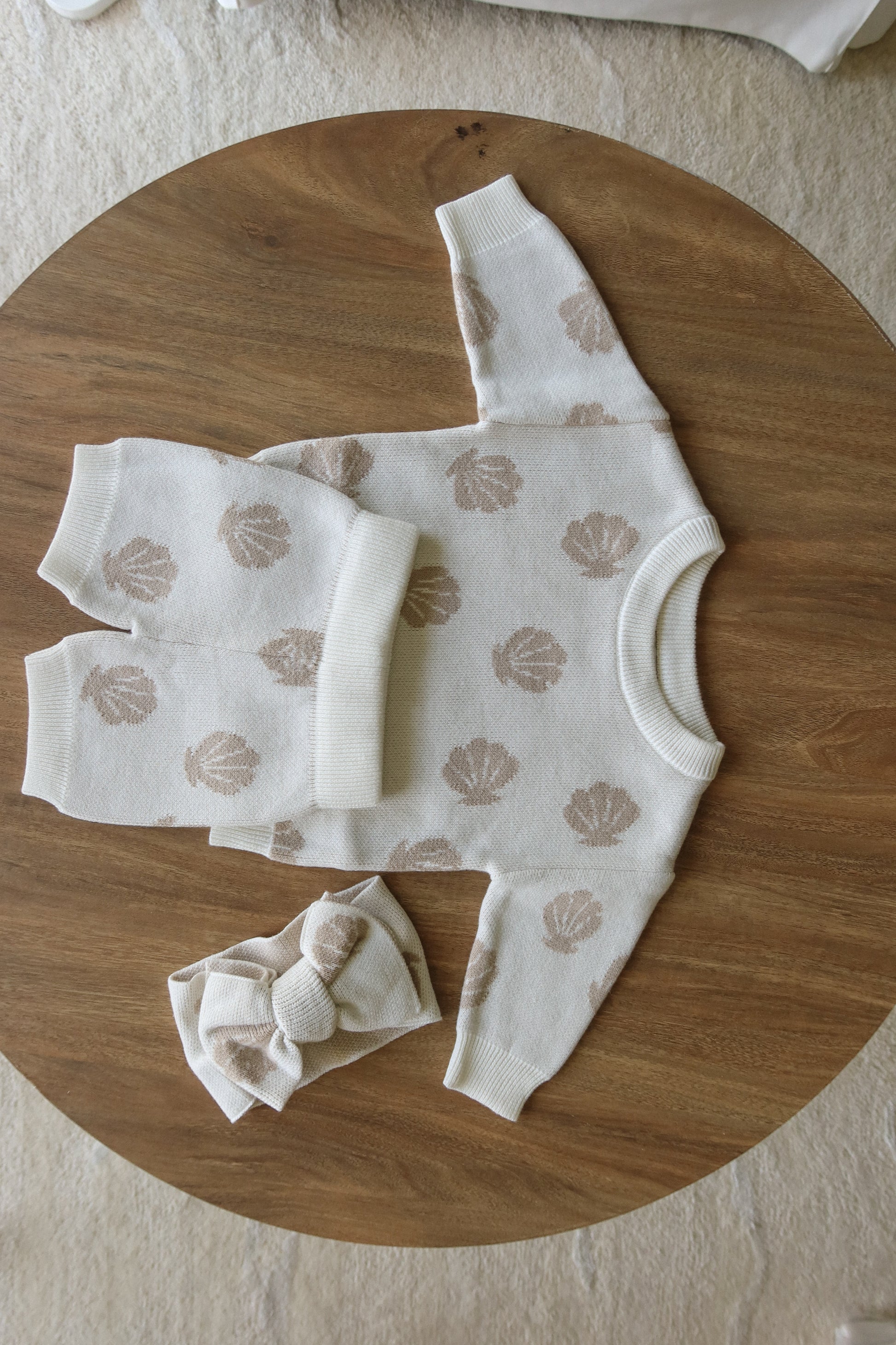Our newly designed shell knit bow is the perfect accessory! Matching blanket, sweater, shorts, and romper available for purchase. This neutral bow is the perfect touch to any outfit for your little one