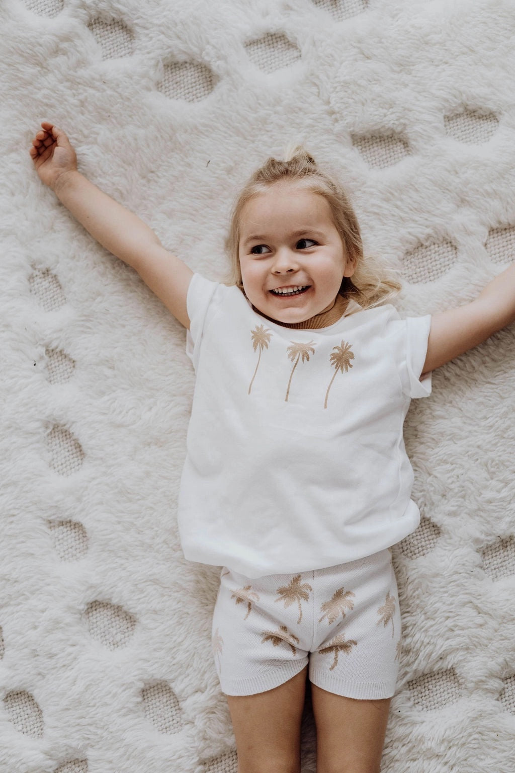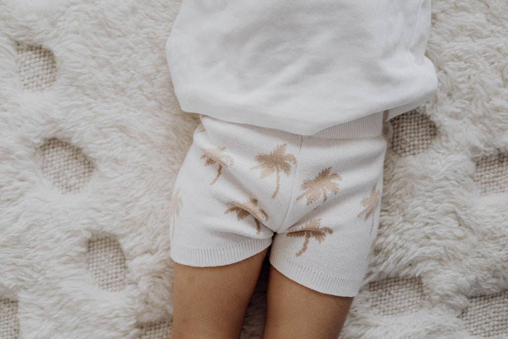 Palm Knit Shorts are a perfect piece for your little ones summer wardrobe! The knit is light weight making it perfect for summer. Soft waistband elastic to ensure no digging in to the waist, featuring a ribbed waistline and ribbed cuffs around the hems.