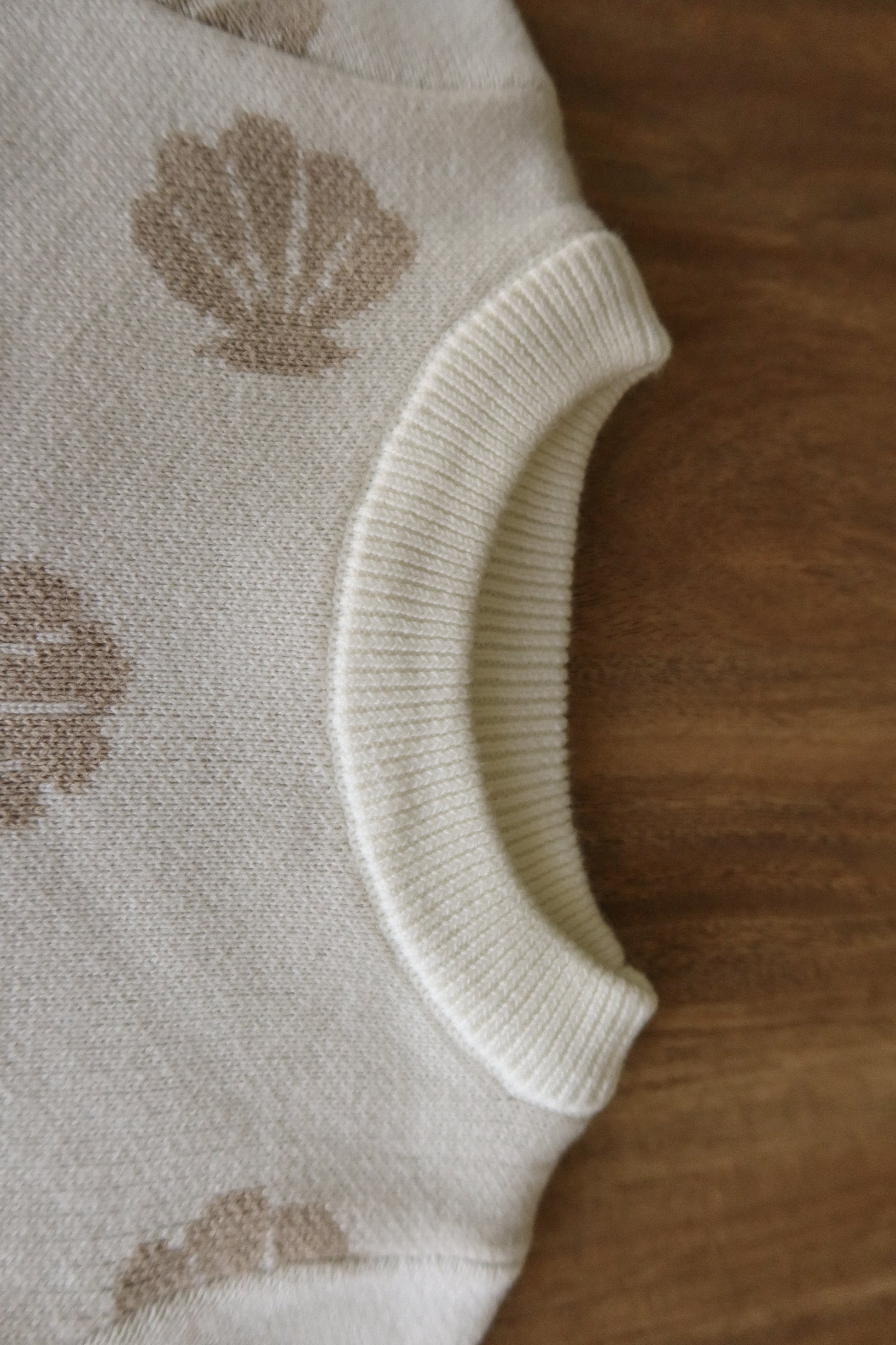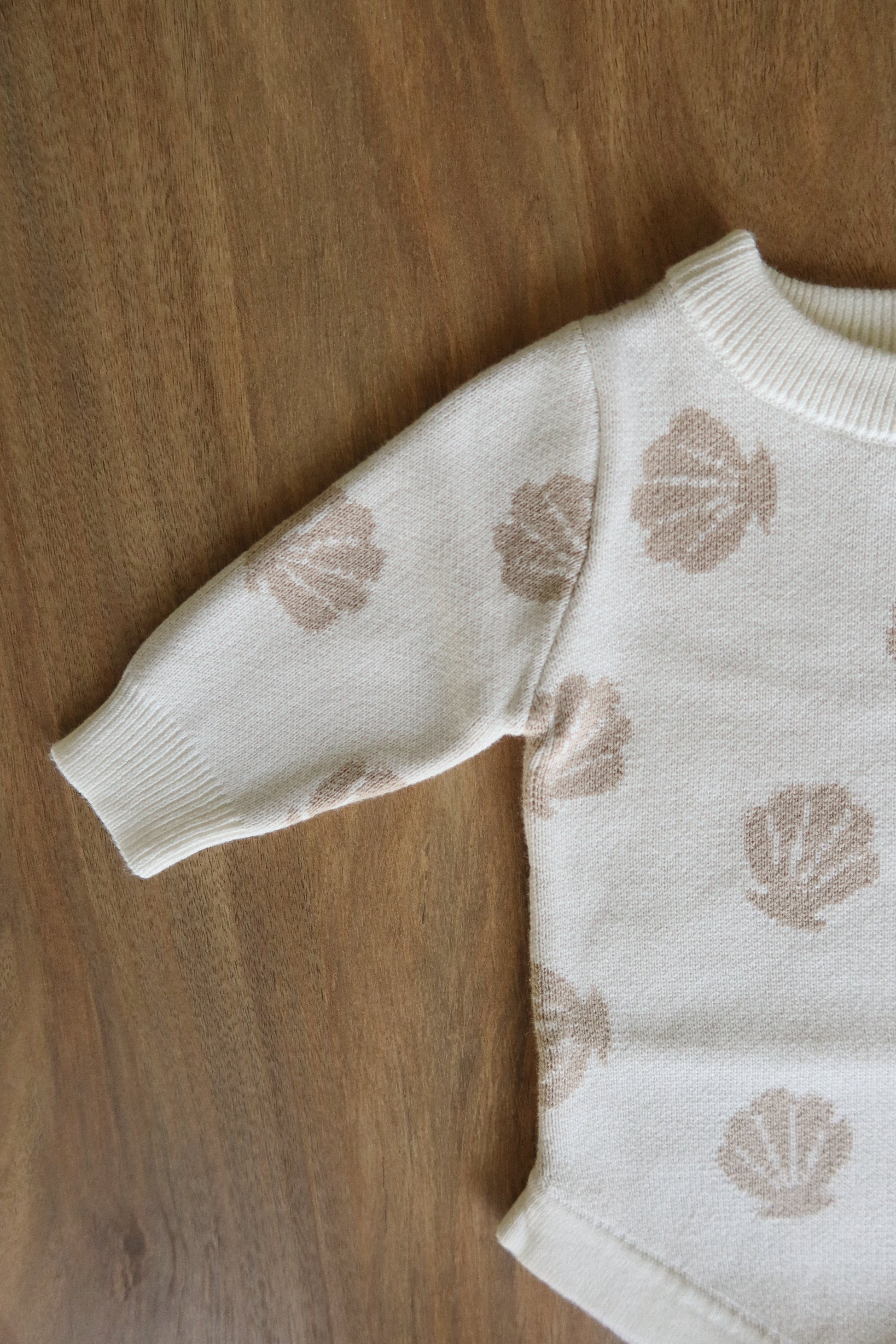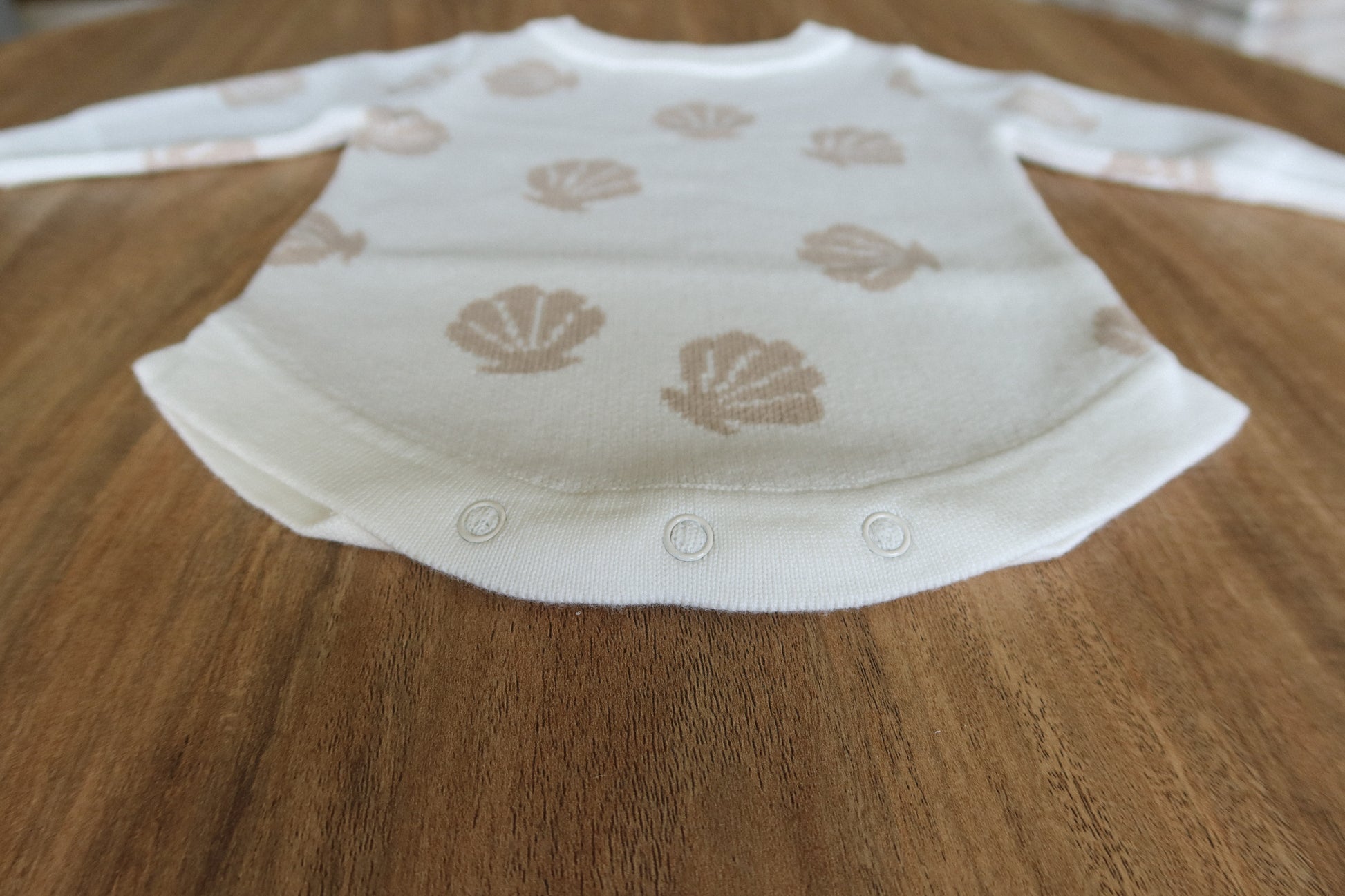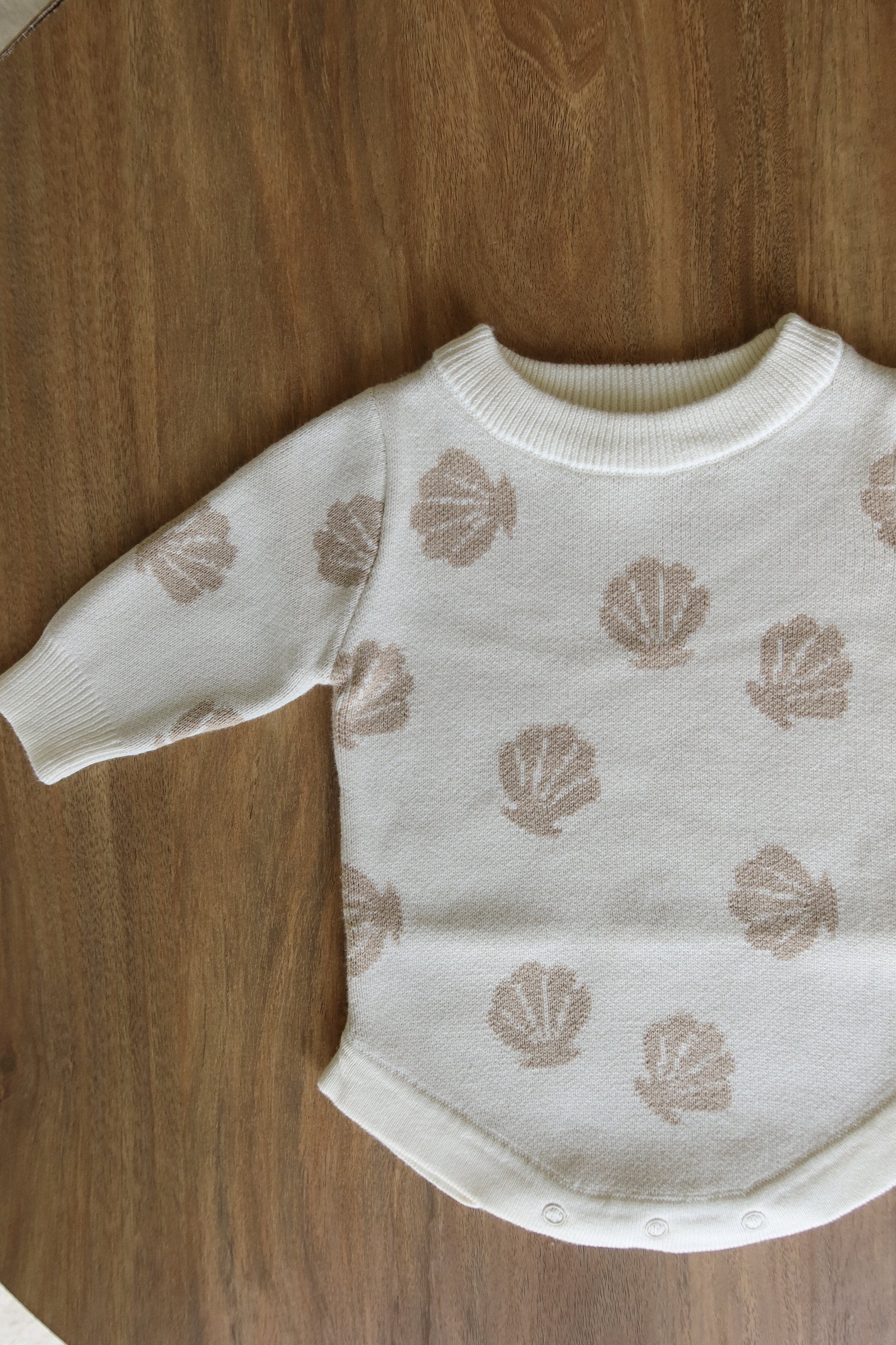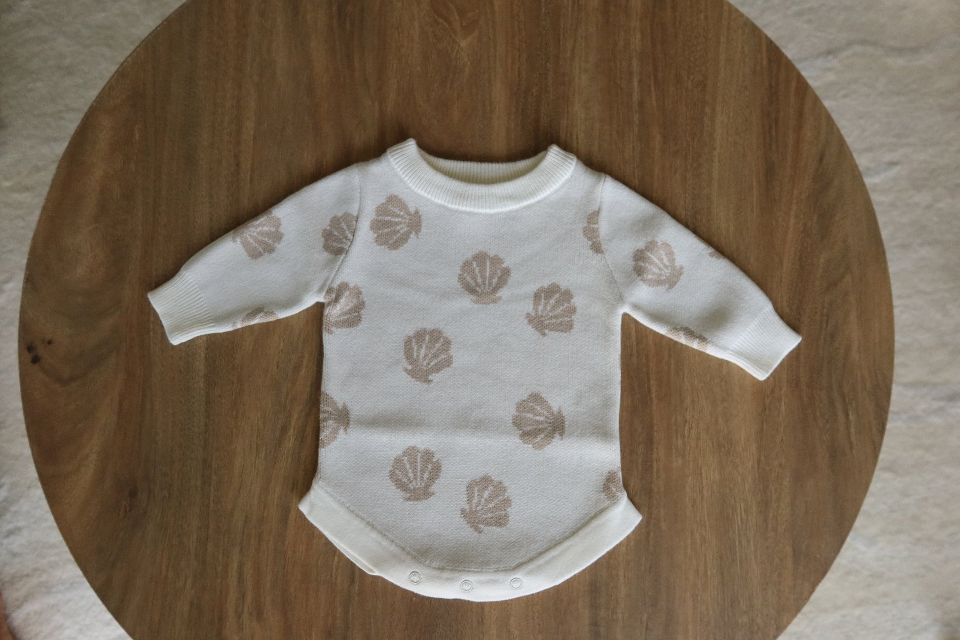 The sweetest seashell knit romper is back & re-designed! Featuring custom knitted seashells, this gender neutral piece is sure to be a wardrobe favorite.