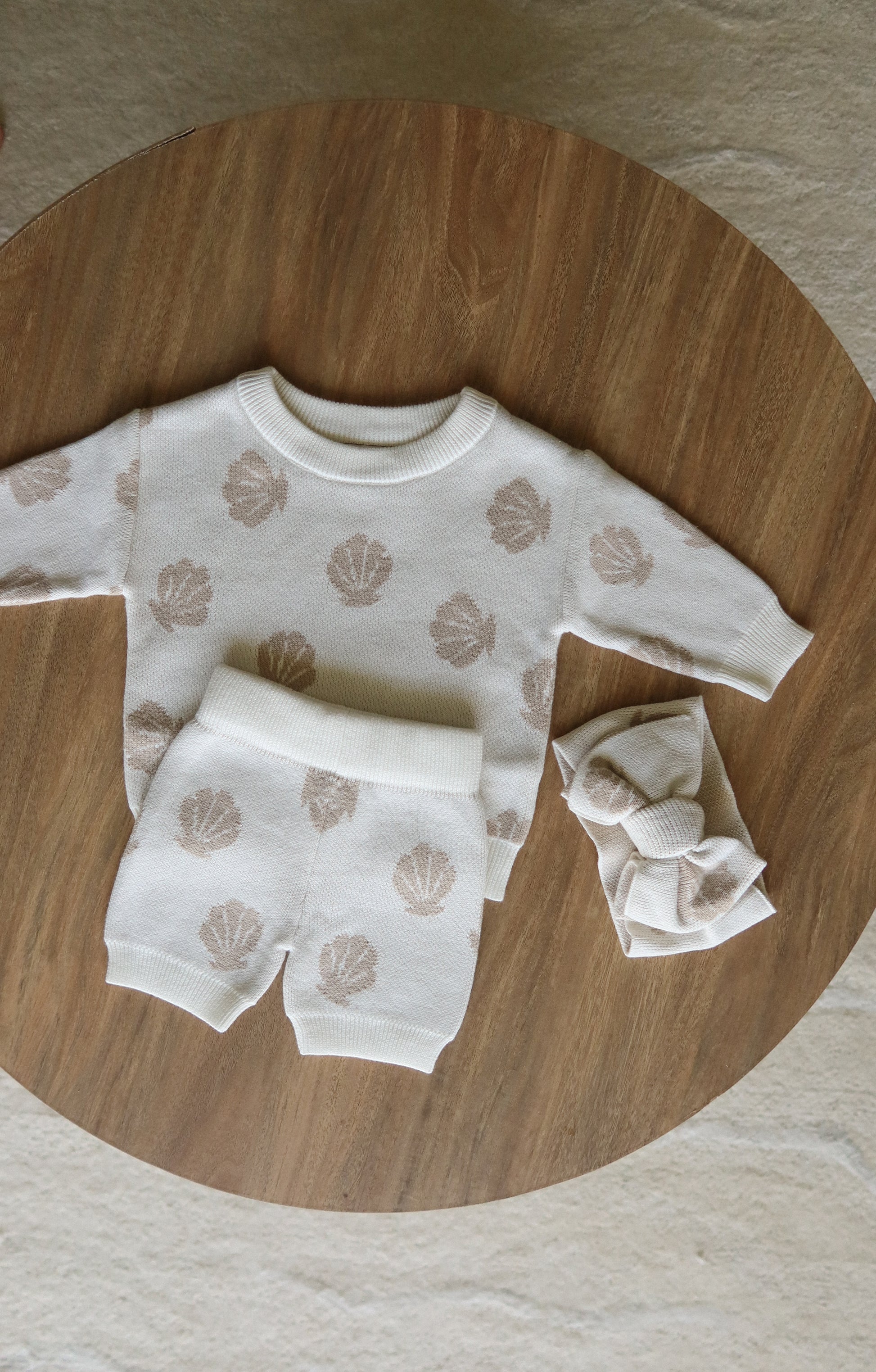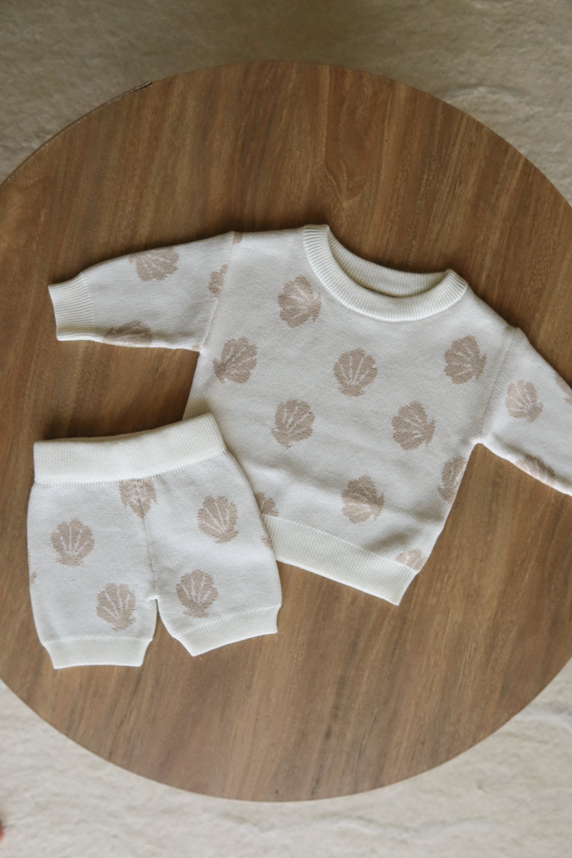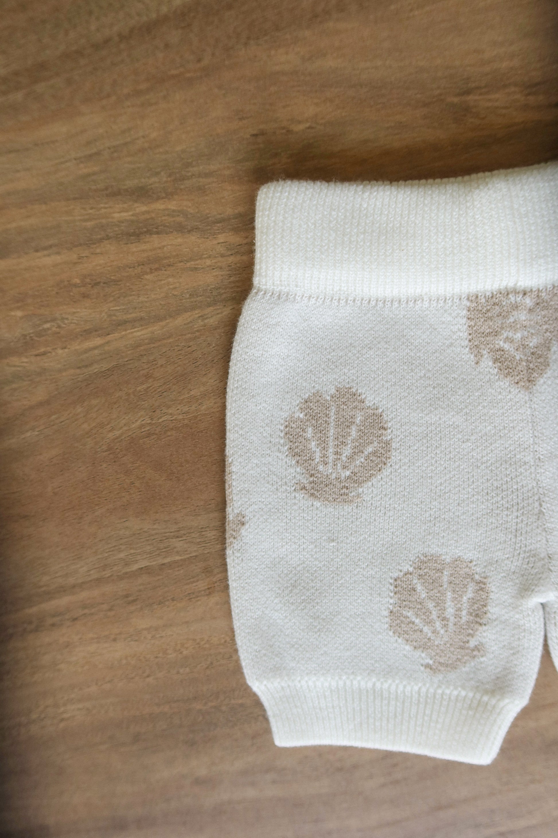 Our shell knit shorts are a perfect piece for your little ones wardrobe. These unisex knit shorts are designed with neutral colors making it easy to match with anything! The ultra-soft shorts features a white base adorned with a subtle all-over tan seashell print—perfect for tiny trendsetters who love a touch of the tropics. Crafted from 100% breathable cotton knit, they offer comfort, style, and a relaxed coastal feel.